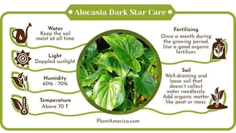 Care for Alocasia dark star plant by giving it indirect light, keeping the soil moist, and using well-draining soil. Also maintain high temperatures, and high humidity and fertilize once a month. The same approach can be applied to more rare Alocasia varieties.