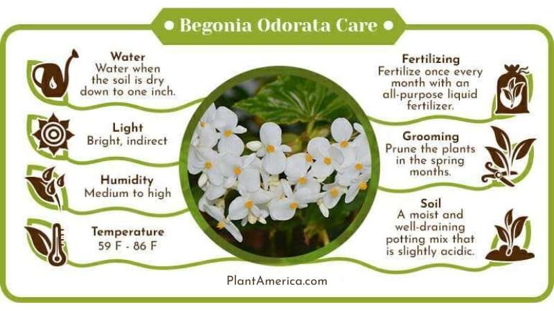 The ideal temperature for the growth of Begonia odorata is from 59 to 86 degrees Fahrenheit. It grows in every season and can tolerate higher temperatures too if protected from direct sun.