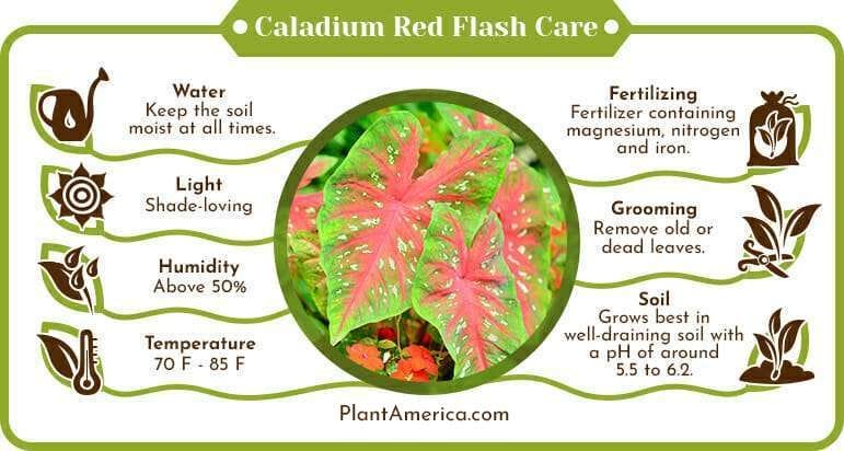 The red Caladium flash plant needs more than 50 percent humidity at all times to grow to its full size and potential. You need to keep a hygrometer in your house to gauge the levels of humidity around your plants.