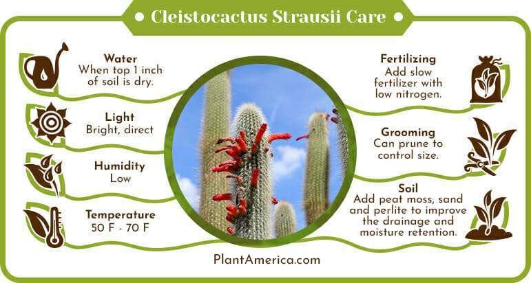 Like all other cacti plants, Cleistocactus strausii does not tolerate extremely hot temperatures. The wooly cactus prefers temperatures that are above 70 F, coupled with low humidity. The Cleistocactus strausii can survive low-temperature ranges of 50 F to 59 F. If temperatures fall below 50 F, consider taking your succulent indoors.