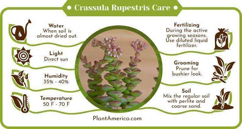 Crassula Rupestris grows well in moderately warm temperatures. It thrives in average summer temperatures of 50 to 70 degrees Fahrenheit. Under optimal conditions, it grows well at nighttime temperatures of 50 to 55 degrees Fahrenheit.