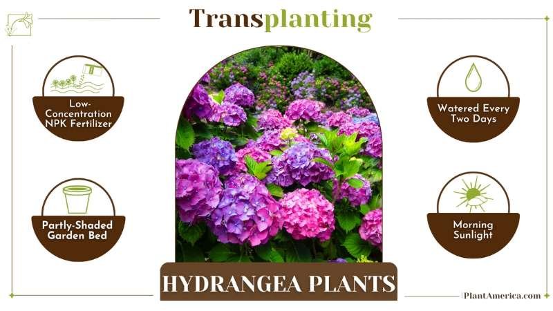 The factors that ensure a successful hydrangea transplanting procedure include an environment with soil that retains moderate moisture, good sunlight, proper plant spacing, and adding fertilizer to the plant. Also, carefully monitor the acidity or alkalinity of your soils because the color of hydrangea flowers depends on the pH.
