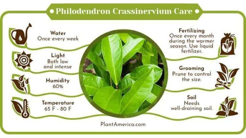 Care for the Philodendron crassinervium plant by providing it with adequate light and watering it once every month. This Philodendron plant needs 60 percent humidity, high temperatures, and occasional fertilizing.