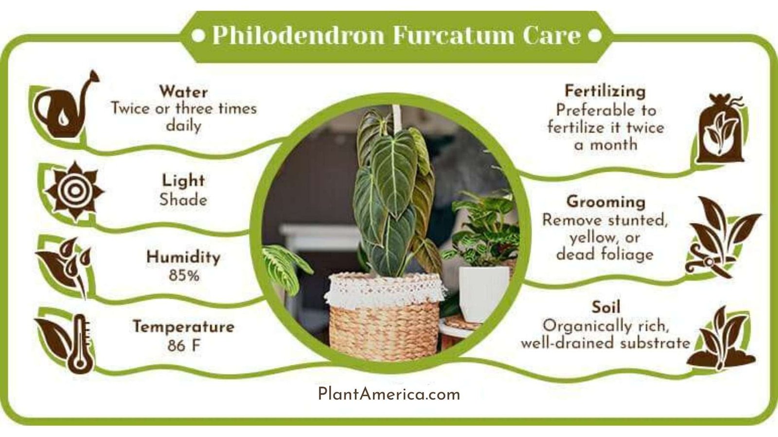 For optimal leaf size, color, and structure, grow the Philodendron furcated in some shade, away from direct sunlight that can dry the plant out and cause crunching of the foliage.