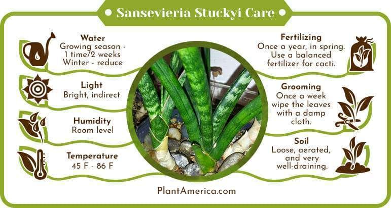 Very little feeding is required to keep your Sansevieria stuckyi growing. Once a year, preferably in spring, you can use a balanced fertilizer designed for cacti, diluted to half strength.
