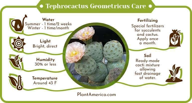 Accustomed to adapting, Tephrocactus geometricus will thrive even in shady spots, but in that case, it will grow more slowly and bloom rarely or not at all. In summer, you can take the plant outside to the garden in a bright and sunny place.